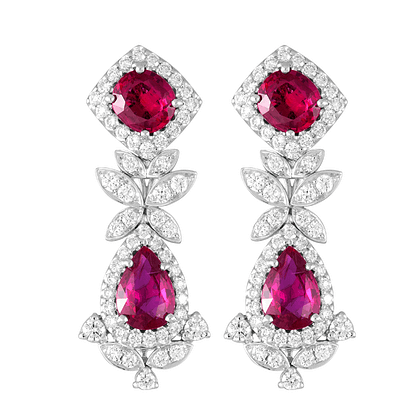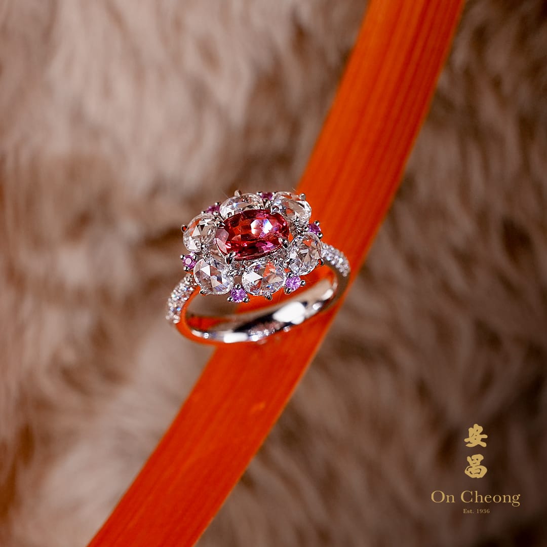 Coloured Gemstones, E-Shop, Jewellery, Rings, Ruby, Towards 90A vivid oval-cut ruby glows like the heart of a blooming rose, encircled by a halo of dazzling rose-cut diamonds and delicate pink sapphire accents. The diamond-encrusted band adds a touch of timeless sophistication, completing the design with radiant brilliance. This exquisite ring evokes the romance of a blossoming garden at dawn, making it a perfect symbol of love, passion, and everlasting charm.