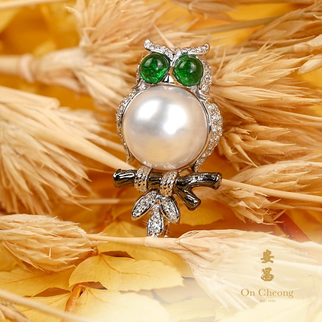 Brooch, Coloured Gemstones, E-Shop, Emerald, Jewellery, Pearl, Towards 90A charming owl brought to life with vivid emerald eyes and a luminous South Sea pearl body, perched gracefully in white gold and diamonds. A symbol of wisdom with a touch of whimsy.