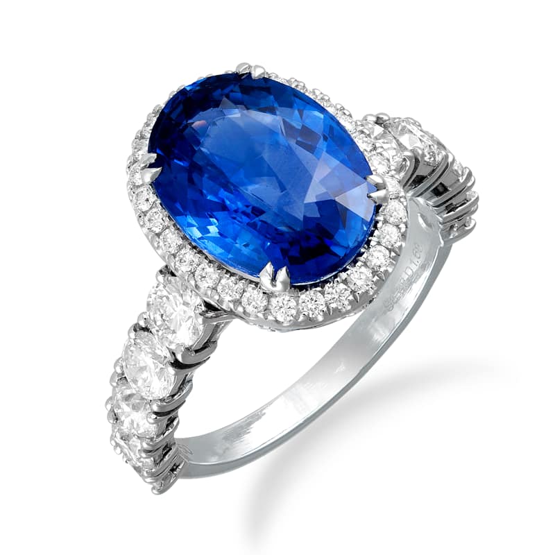 蓝宝钻石戒指以750白金制造,缀以 6.08卡蓝宝和圆钻。