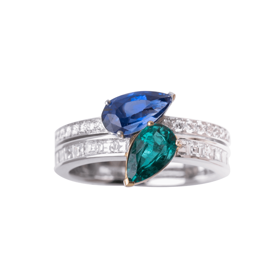 材质: 750 白金 方形 28 粒 + 钻石圆形 20 粒 0.86 卡 绿宝石梨型 1 粒 0.96 卡 蓝宝石梨型 1 粒 1.22 卡 尾指 15