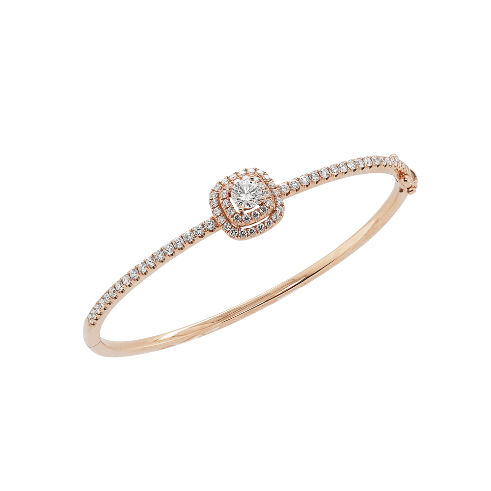 货号: DG18386材质: 750玫瑰金圆形钻石 1粒 0.295卡圆形钻石 74粒 0.84卡中心尺寸: 10毫米 x 10毫米手镯尺寸(港码): 52