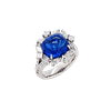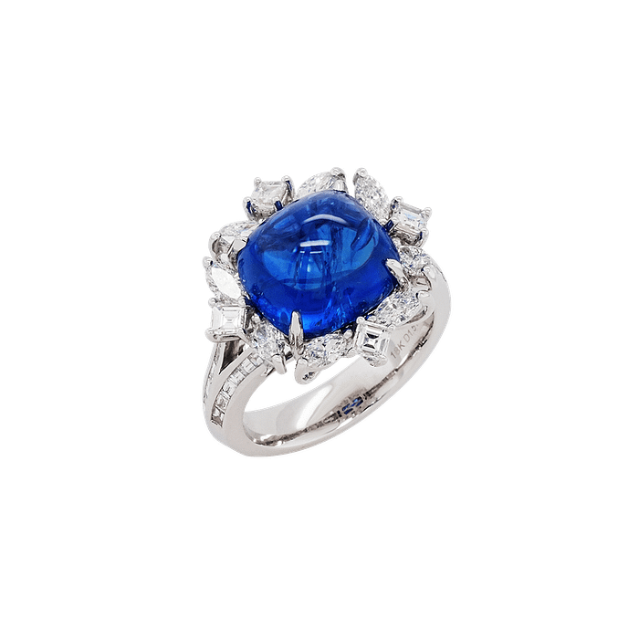 Coloured Gemstones, 在线商店, 戒指, 珠宝, 蓝宝石, 迈向90Bold expression of regal elegance, featuring a mesmerising sugarloaf blue sapphire at its heart. Surrounding the center stone is a dazzling constellation of brilliant, marquise, and baguette-cut diamonds, each meticulously arranged to enhance the sapphire’s luminous depth. The band itself is adorned with delicate diamond accents, adding a final touch of refinement.