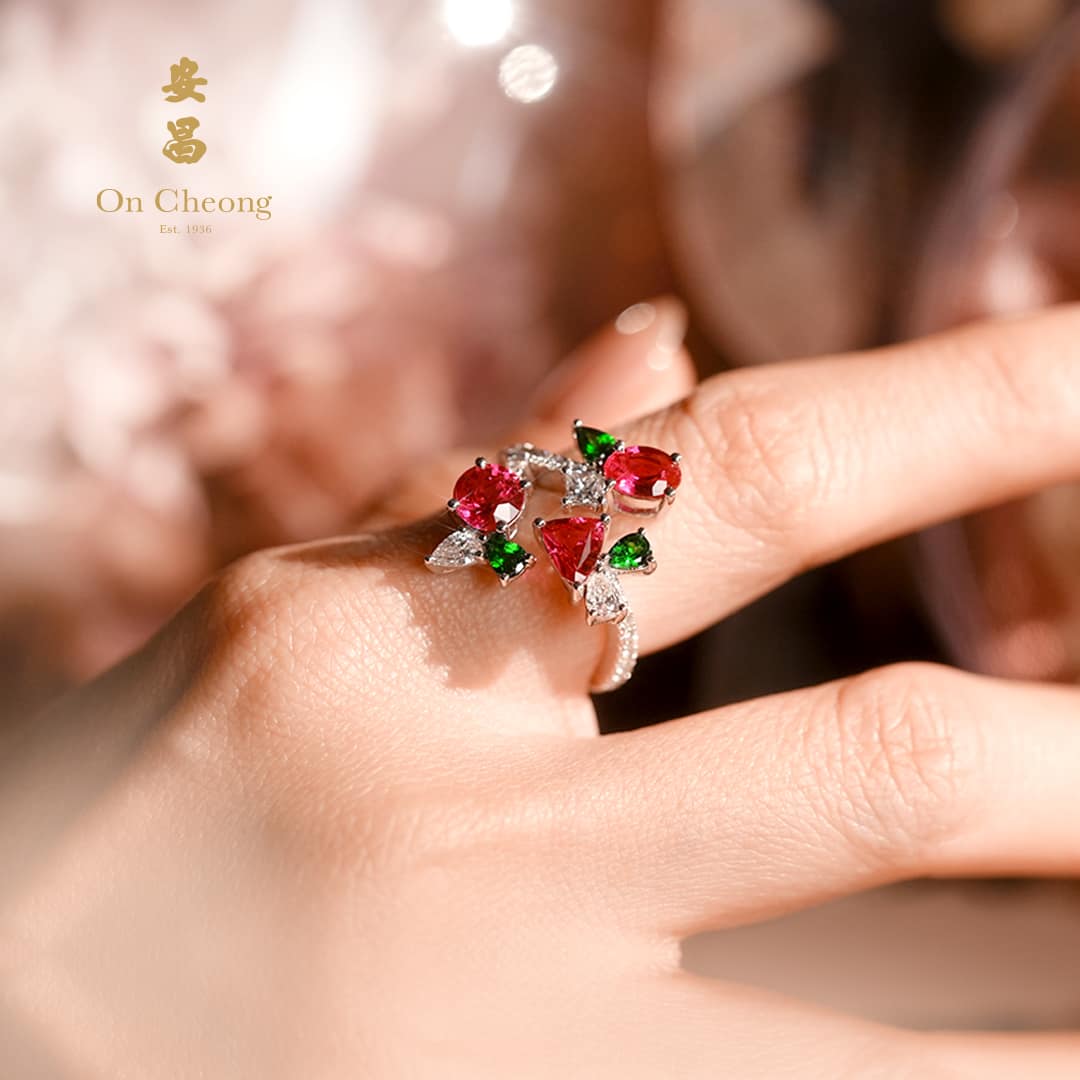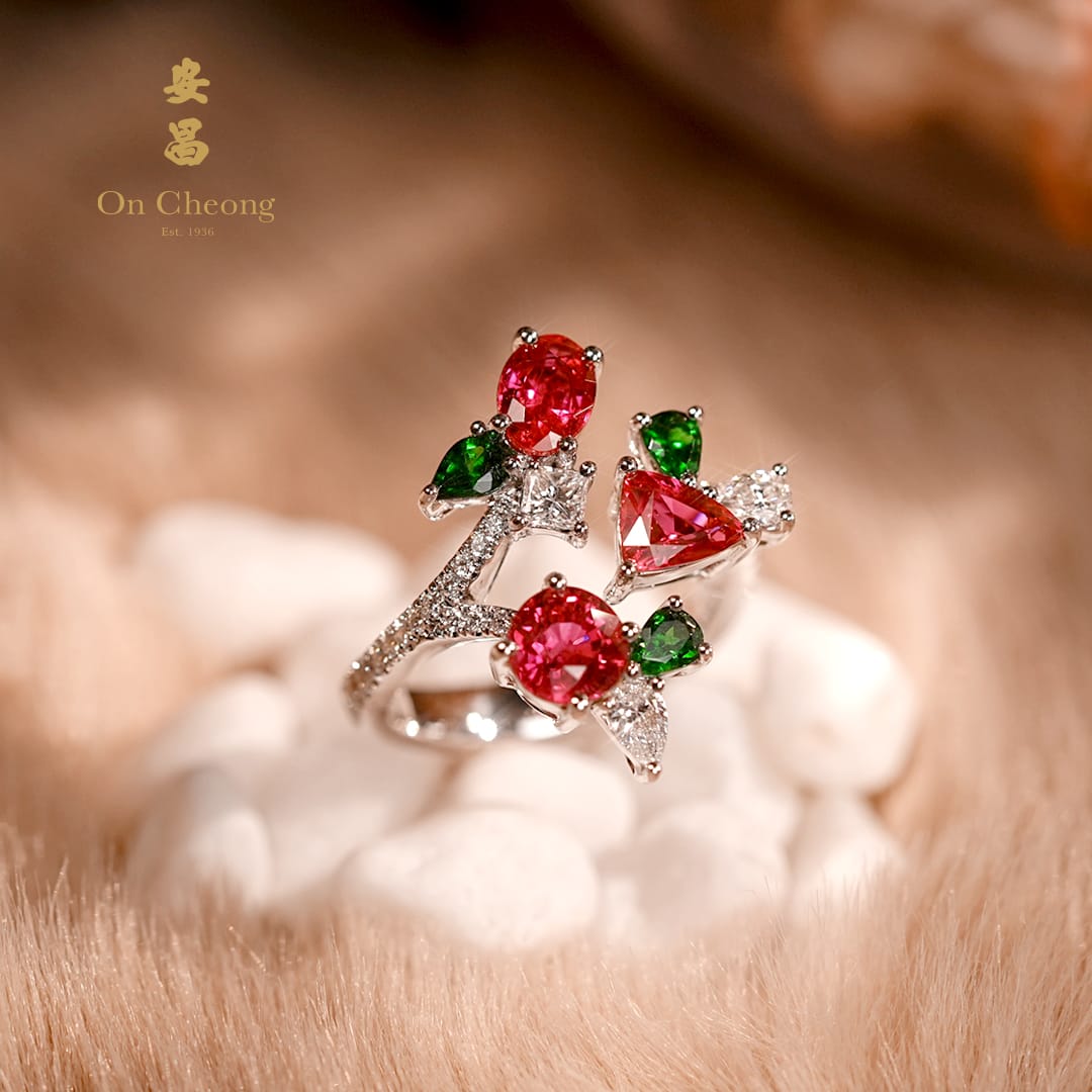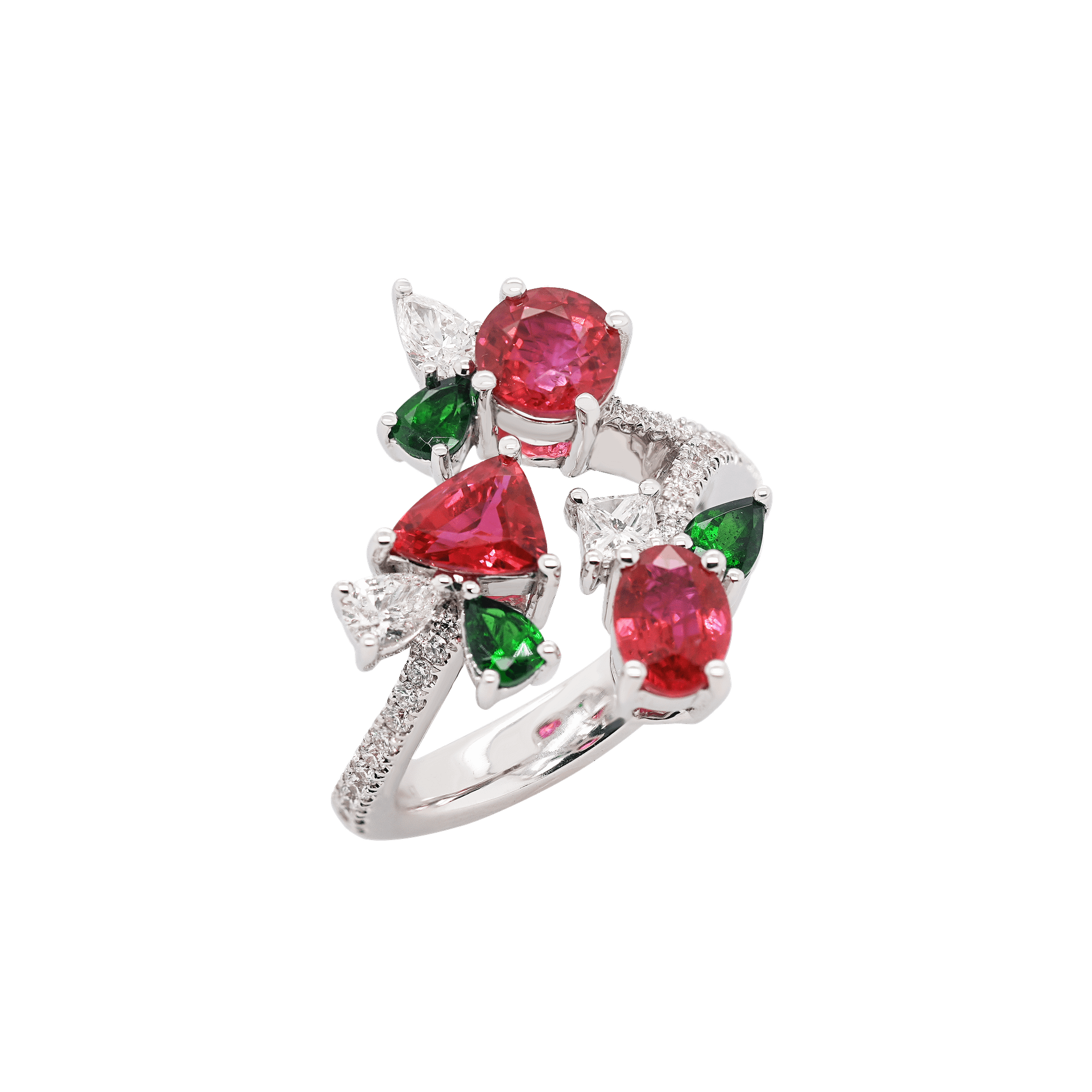 这款白金戒指绽放缤纷色彩,镶嵌鲜艳红宝石、浓郁沙弗莱石与璀璨钻石,采用花卉造型切割,错落有致,优雅迷人,仿佛盛开的花园,洋溢着生命的喜悦。