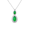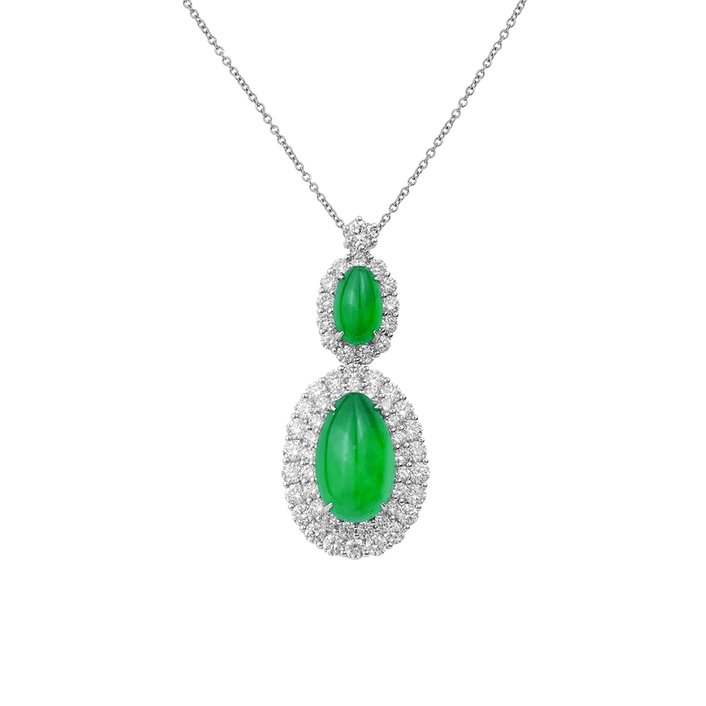 在线商店, 珠宝, 翡翠, 迈向90, 项链 / 吊坠Two luminous jadeite cabochons, one oval and one pear-shaped, are embraced by halos of brilliant diamonds. Their flowing silhouette embodies elegance and poise, while the vibrant green radiates prosperity and timeless beauty.
