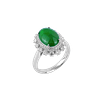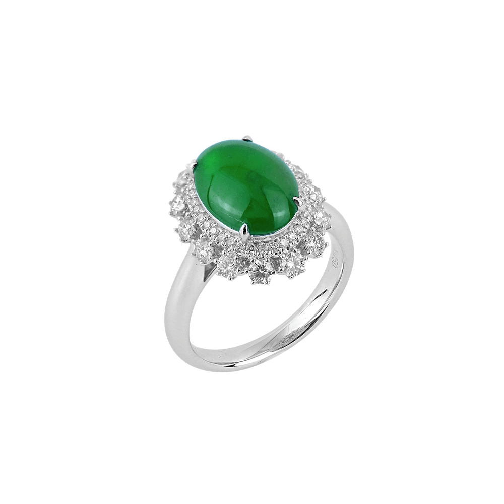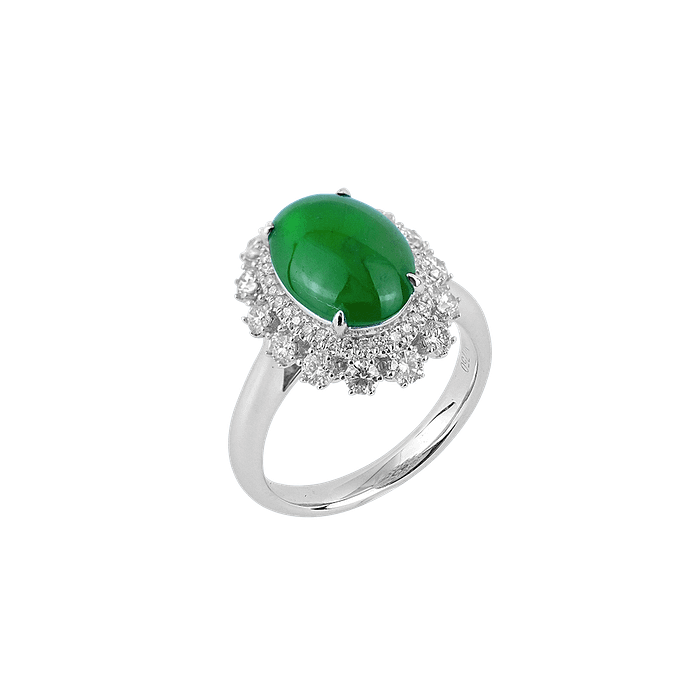 沐浴于光华之间,此戒指以浓翠翡翠蛋面为主石,周围环绕璀璨钻石,光彩熠熠。 宛如晨露承于翠叶之心,寓意纯净、生机与恒久的富贵。 镶嵌于750白金之上,尽显典雅与隽永之美。