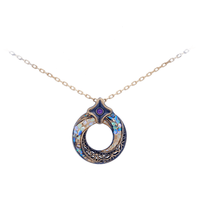 寓意恒久的承诺与代代相传的价值。吊坠中央镶嵌温润的珍珠母贝,随光而映,流转柔和光泽,象征内在的纯净与从容。圆形轮廓代表圆满与合一,层次细节蕴含含蓄而深远的美感。此款作品不止为饰,更如一枚象征之印,承载时间、情感与信念,值得珍藏与传递。