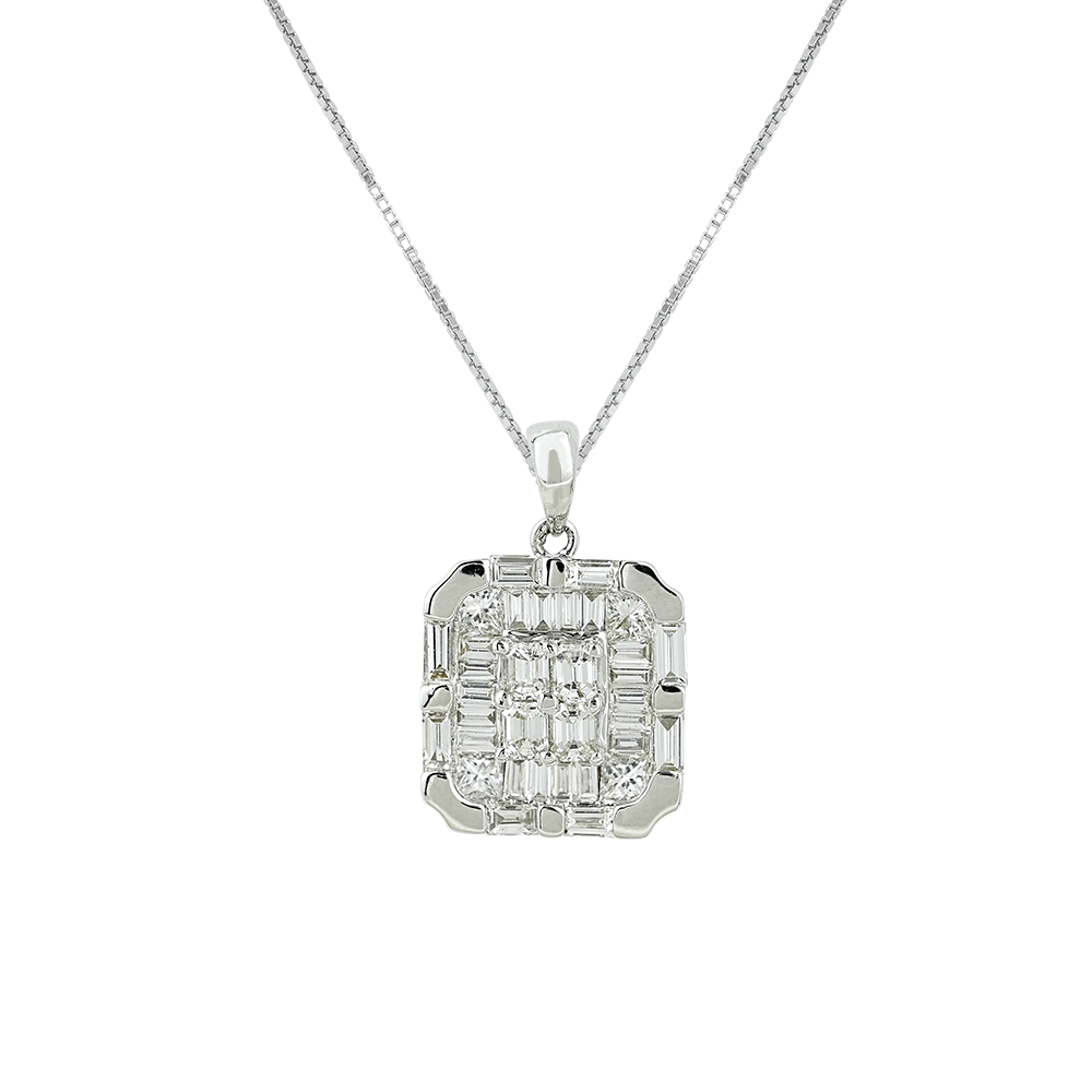 这款吊坠巧妙融合几何美感与优雅气质,以多种切割方式的钻石错落排布,营造出丰富层次与视觉深度。公主方钻、祖母绿切割钻与梯形钻彼此映衬,在简洁利落的线条中折射璀璨光芒,展现独特个性与现代气息。