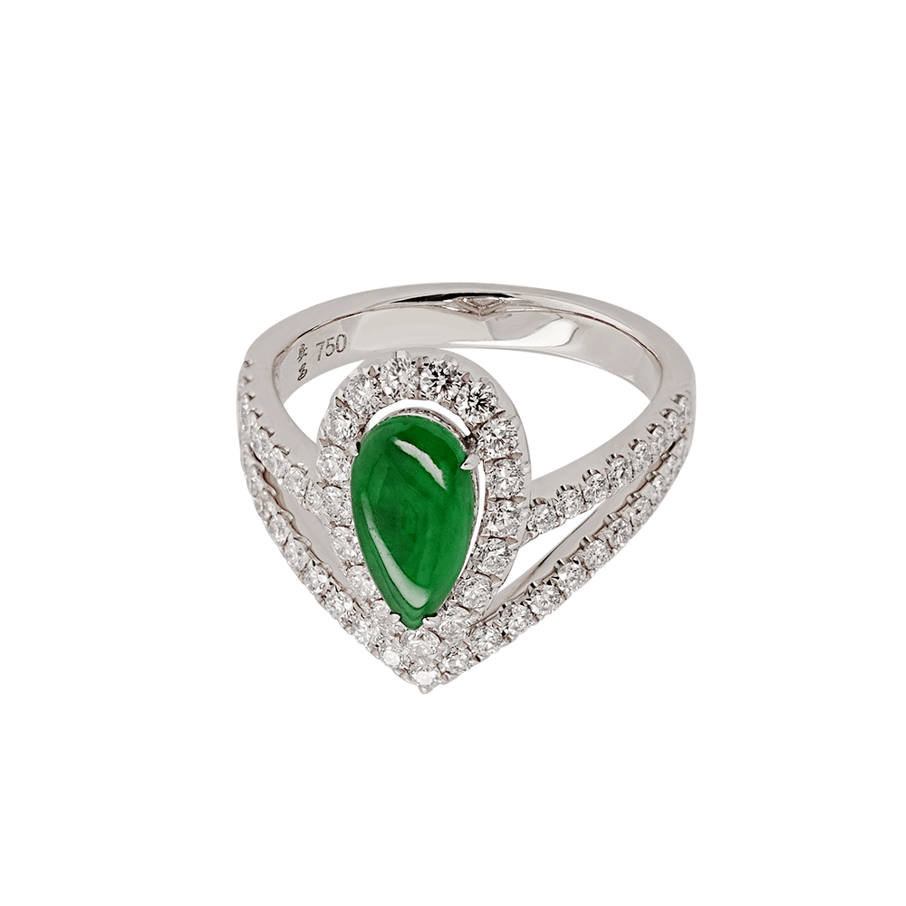 Adorn yourself with the Chasseurs Jadeite Diamond Ring and feel the dance of light and shadow at your fingertips. The serene green of the jadeite pairs beautifully with the brilliance of pavé-set diamonds — a graceful harmony of stillness and radiance.
