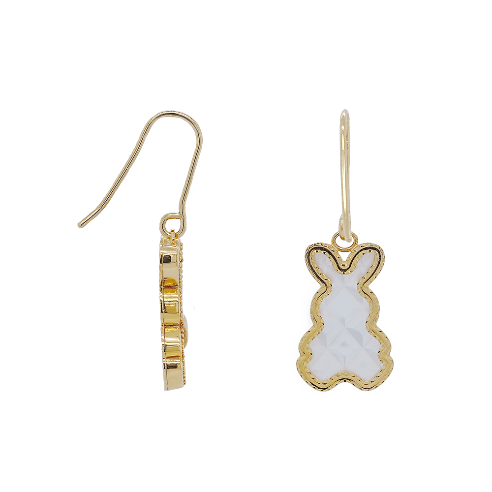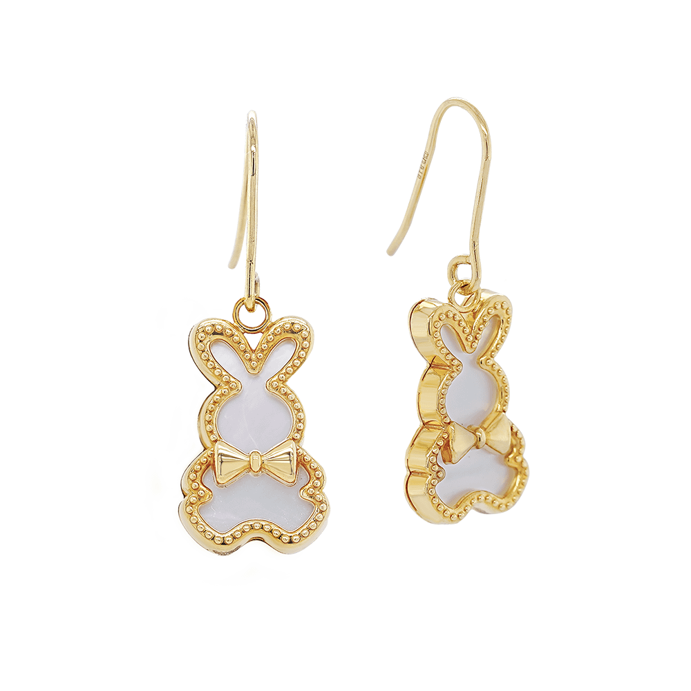 Crafted in 916 yellow gold, these delicate rabbit earrings shimmer with mother of pearl’s soft glow. Tied with a golden bow, they capture playful elegance and timeless charm, reflecting light with every movement—a graceful treasure, kissed by moonlight.