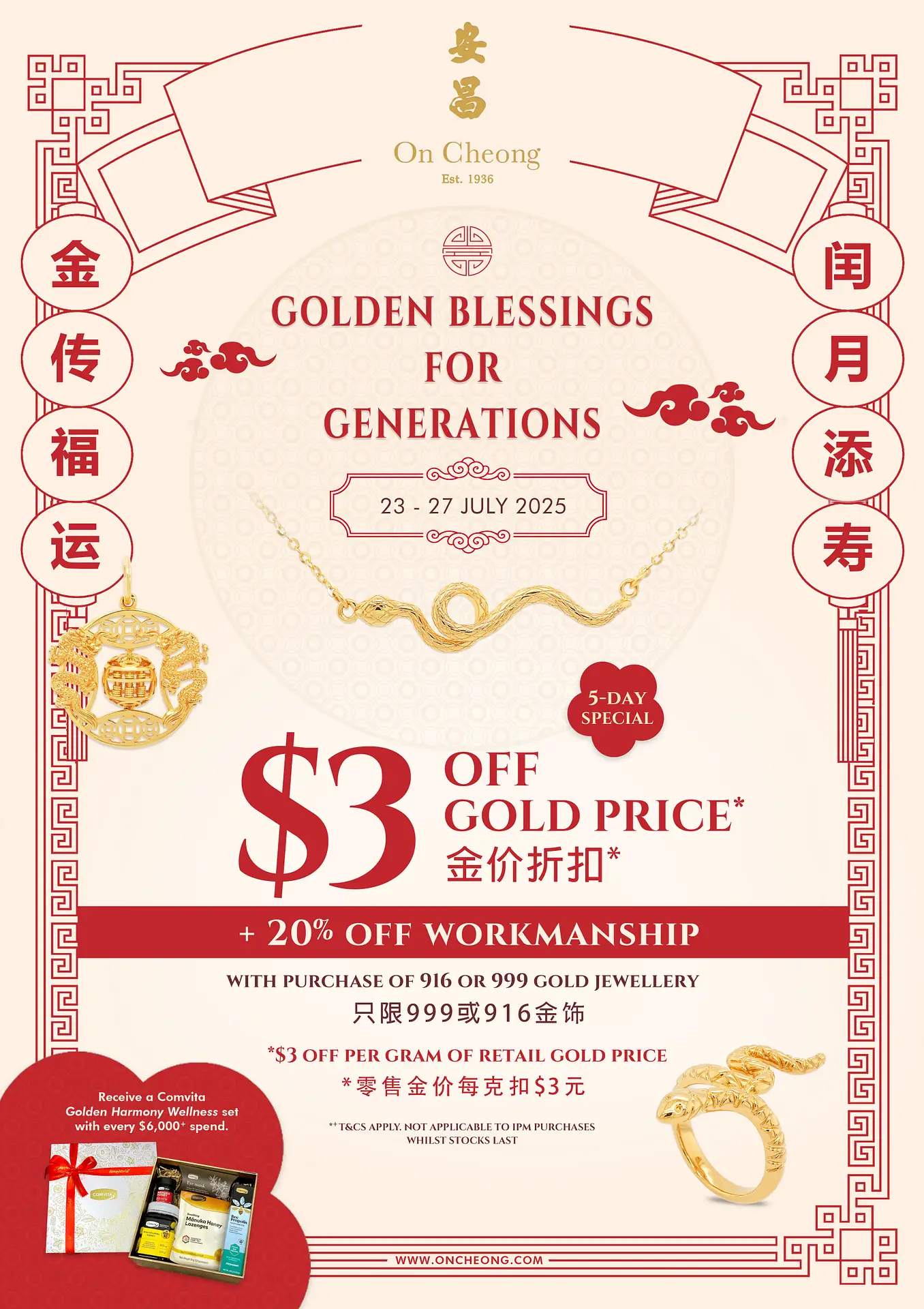 • $3 off retail gold rate + 20% off Workmanship is only for the in-store purchase of 999 and 916 gold jewellery from 23th to 27th July 2025.