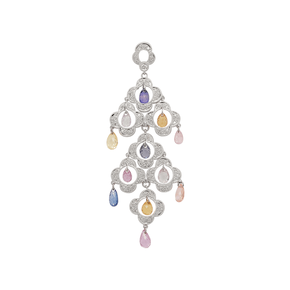 Victorian-inspired pendant showcases a cascading array of pastel sapphires—lavender, pink, yellow, and blue—adorned with delicate diamond accents in white gold. Its lace-like design and teardrop shapes add a timeless elegance, perfect for special occasions.