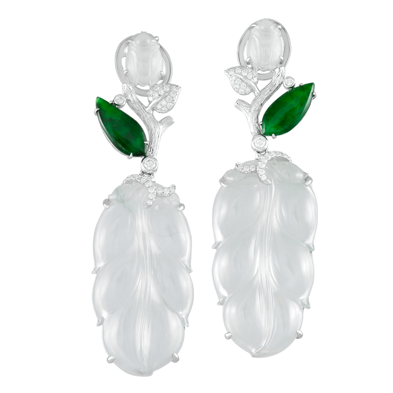 Leaves are Leaves. Hardly could we notice differences between them. But in the eyes of a beetle, only this particular leaf is the ample shelter. Similarly, the one you spend your life with is the one you only focus on among the crowd. With no doubt, this is ‘love’. “Two beetles inherently rested side by side on a leaf of green implied the notion of love is unconditional and in faith inseparable.” Jadeite Diamond Earrings in 750 White Gold.