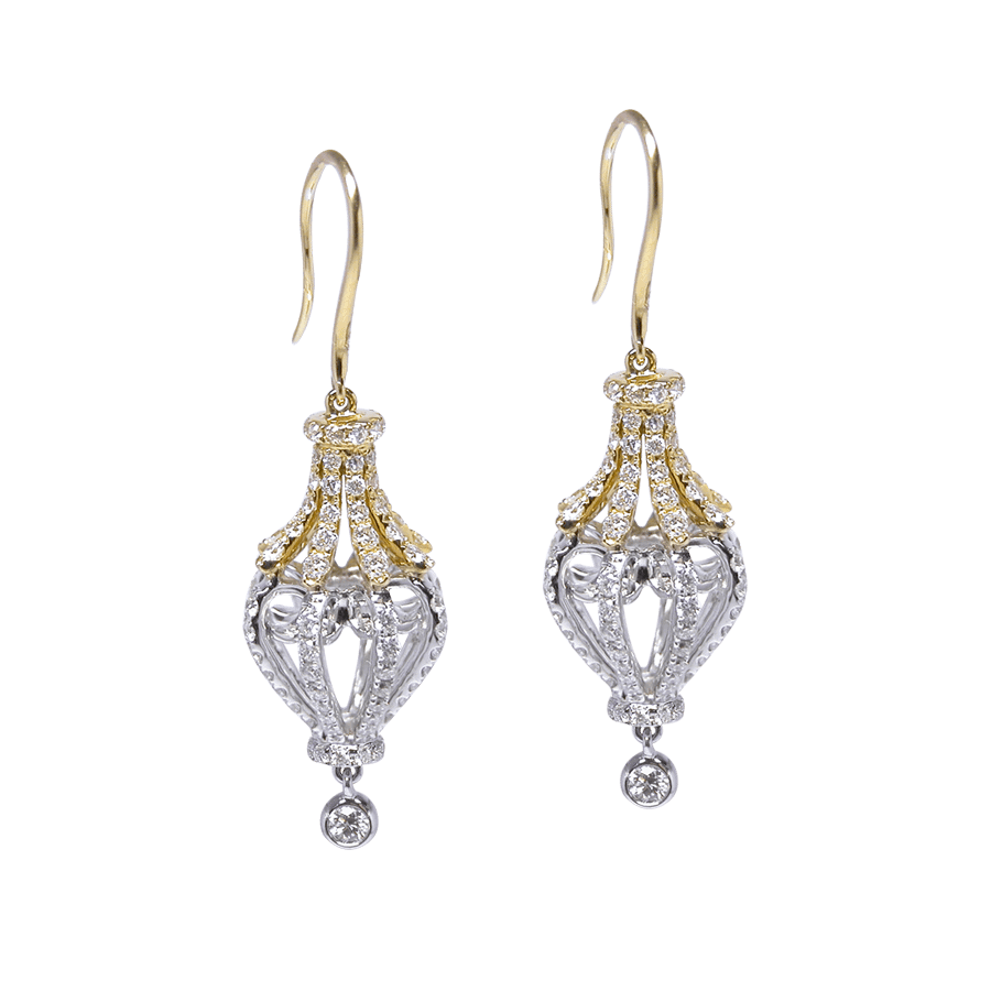 Alluring pair of earrings with its mastery mesmerising centrepiece, embellished with glittering diamonds set in 750 gold. Resembling Chinese Lantern flowers aka Japanese Hozuki, allude to a charming and pleasurable insignia of warmth, and a symbol of protection.