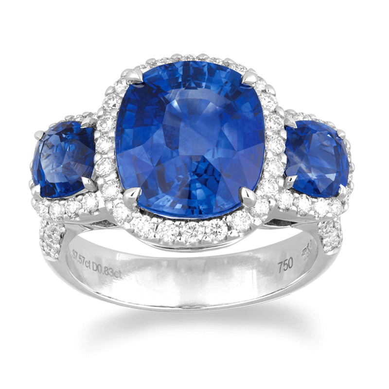 Sapphire Diamond Ring in 750 White Gold set with 3 Cushion Cut Blue Sapphires and Diamonds.