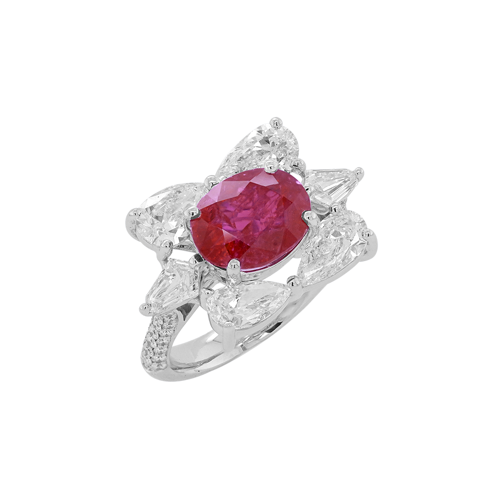 A mesmerising ode to everlasting elegance, the Rosé Éternelle Ruby Diamond Ring features an unheated ruby of vivid crimson allure, embraced by a constellation of pear- and kite-cut diamonds that bloom like radiant petals. The fluid composition evokes the tender grace of a blossoming rose, symbolising love’s enduring flame and timeless beauty. An exquisite statement of natural rarity and refined craftsmanship — a celebration of passion, purity, and permanence.